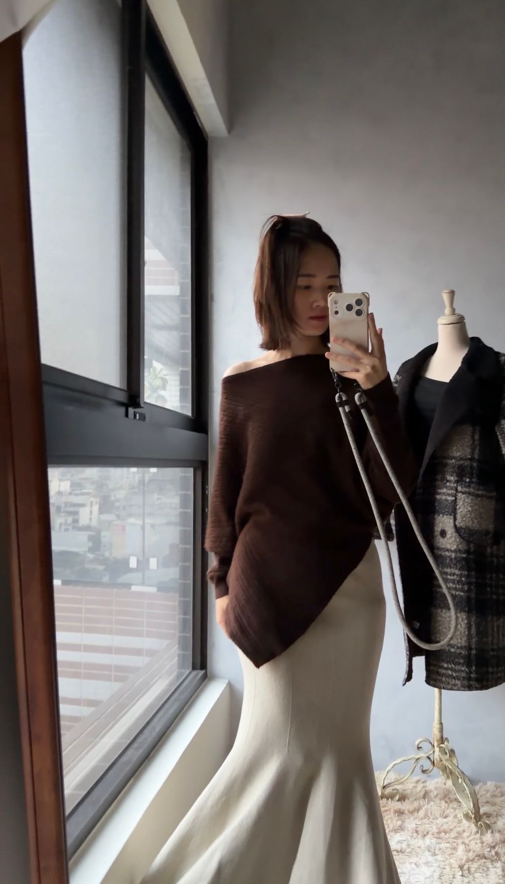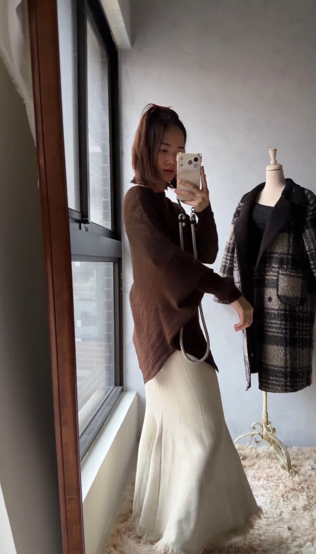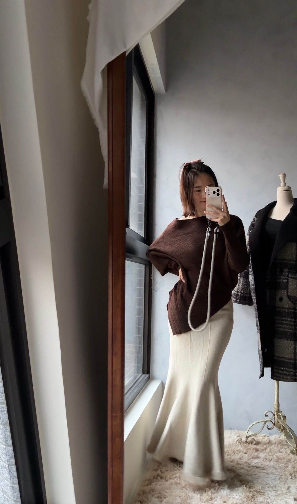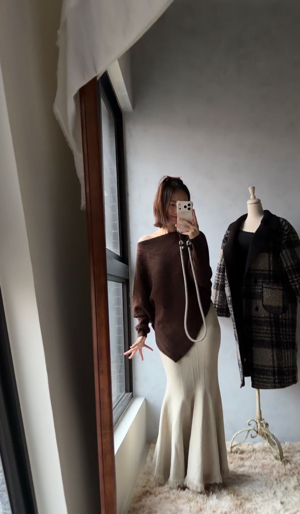 百搭低飽和度燕麥色,全彈力優質針織,可以穿到70kg沒問題,兩種裙長:正常84cm、加長94cm,我166/50穿加長版在中腰位置🤩🙌