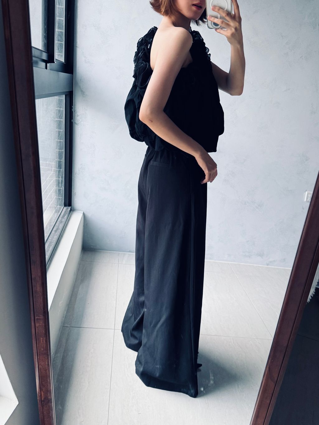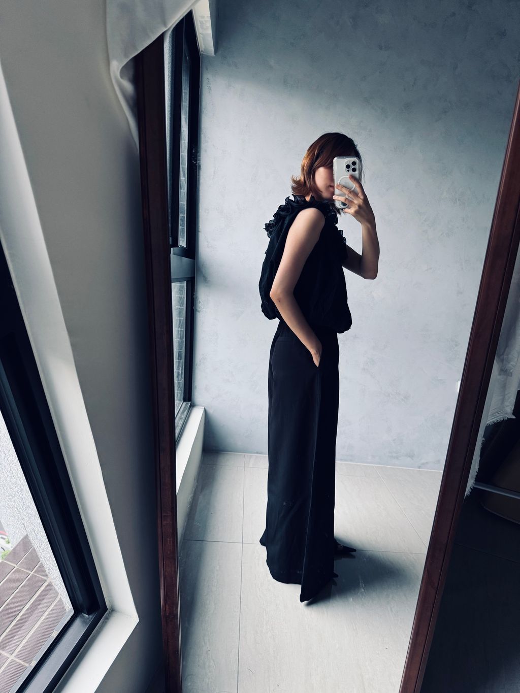 搭配垂墜收腰修身的下半身(例如我搭配的俐落大寬褲)或牛仔褲或長裙