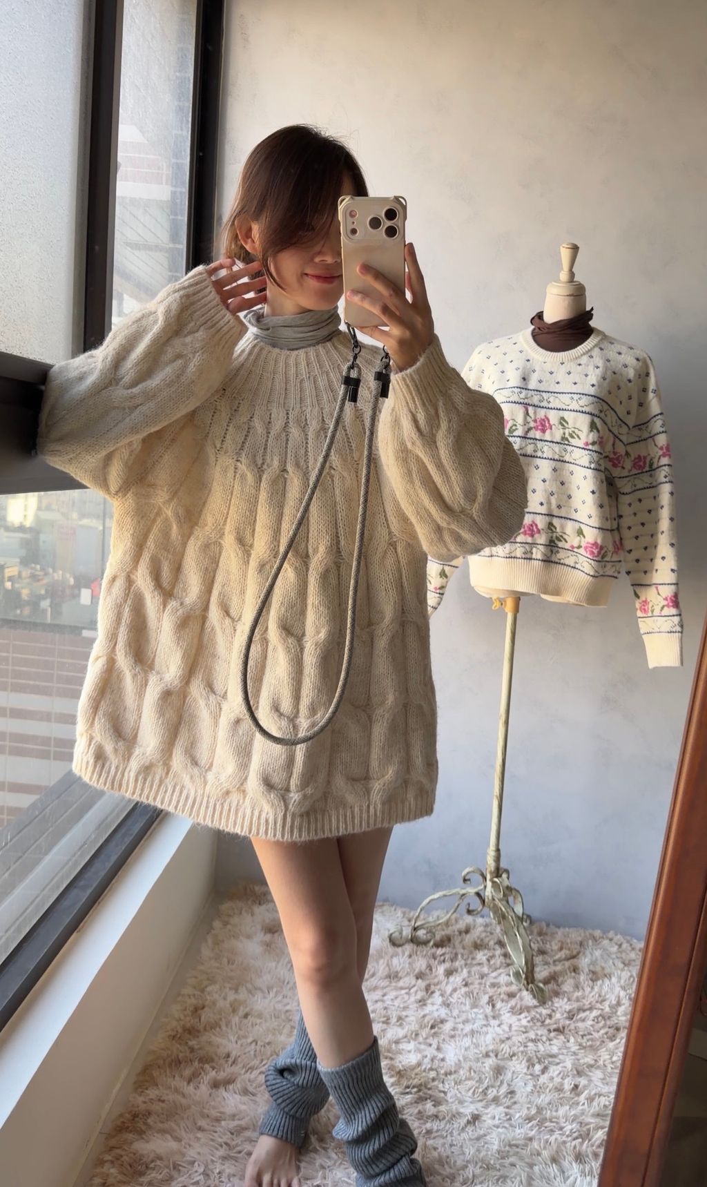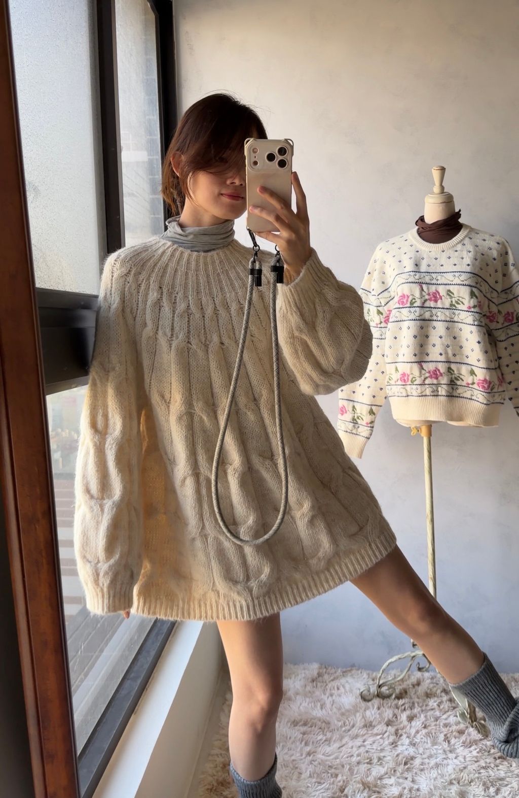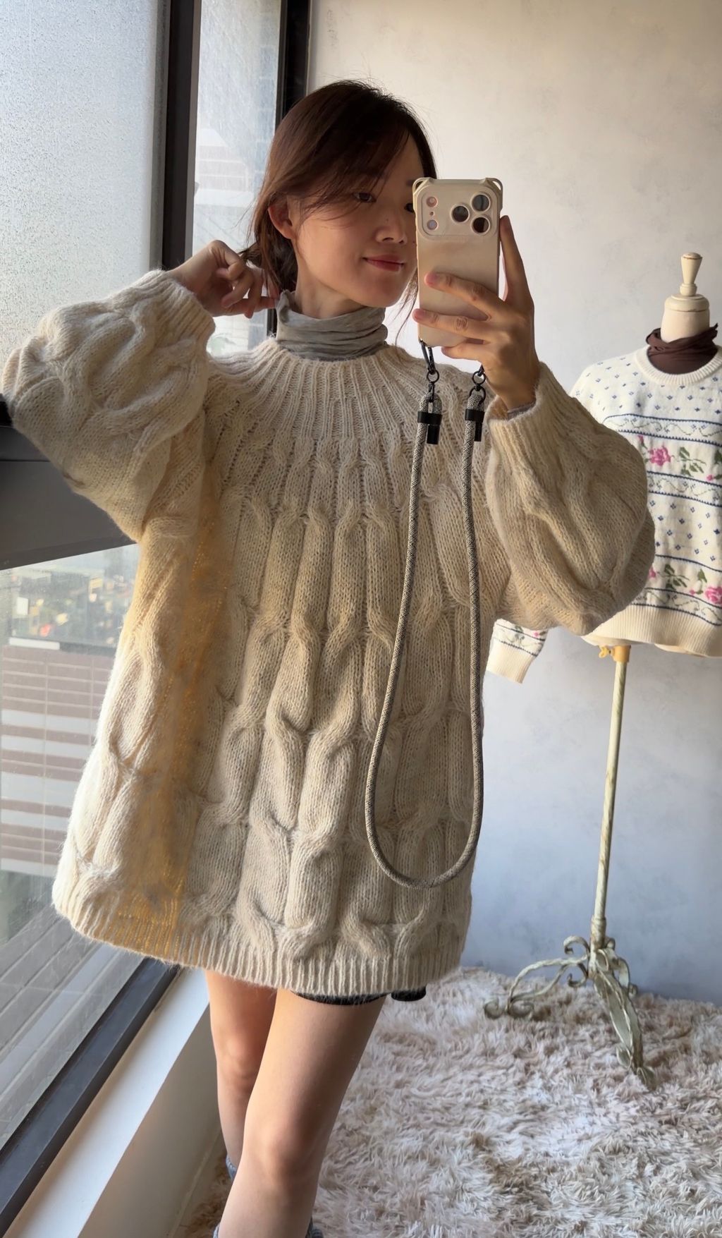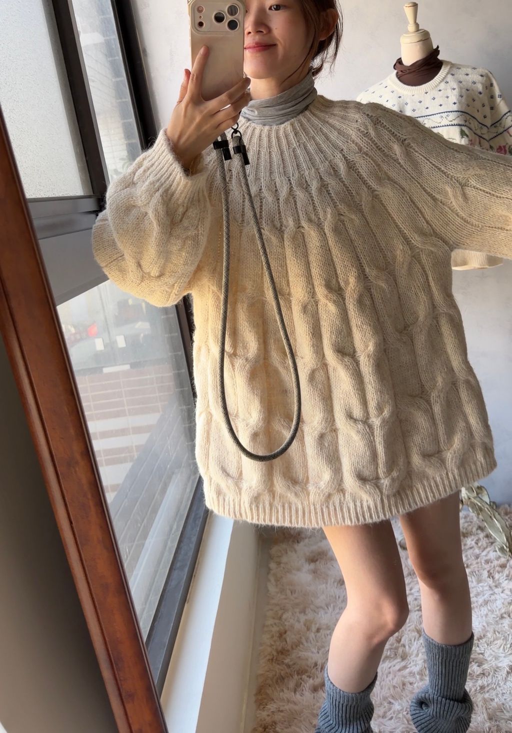 [C] 顯嬌小版型*軟軟鬆鬆大麻花針織蓬蓬袖長版毛衣洋裝|適S-XL