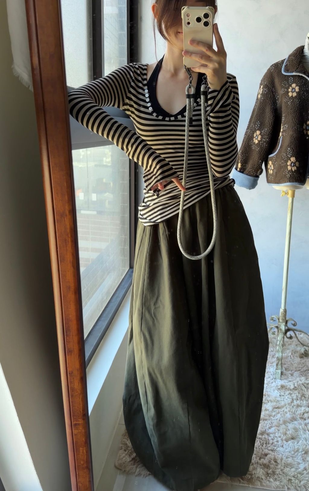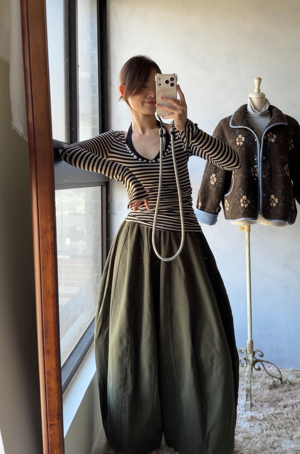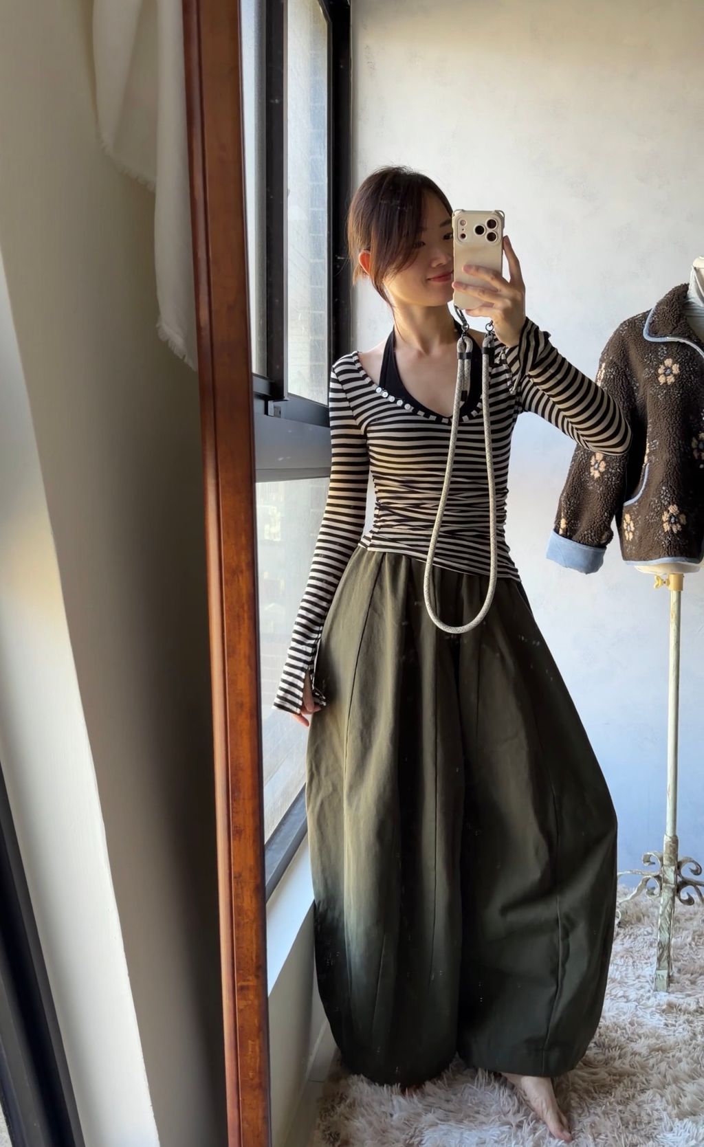 搭配的十六片拼接大寬褲是這件軍綠色:
