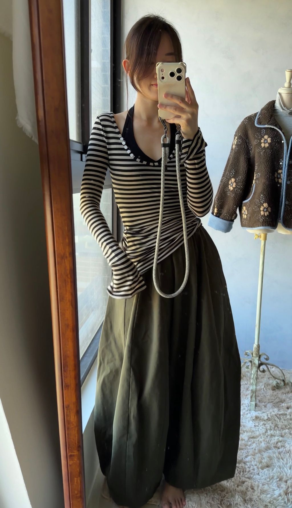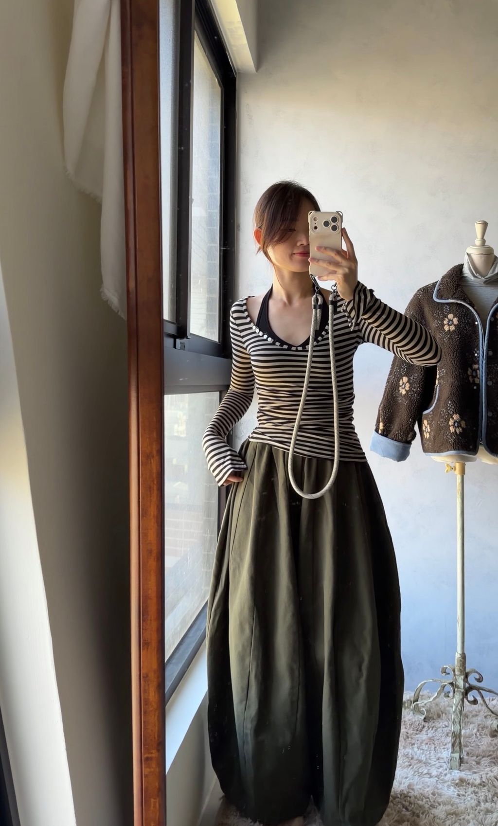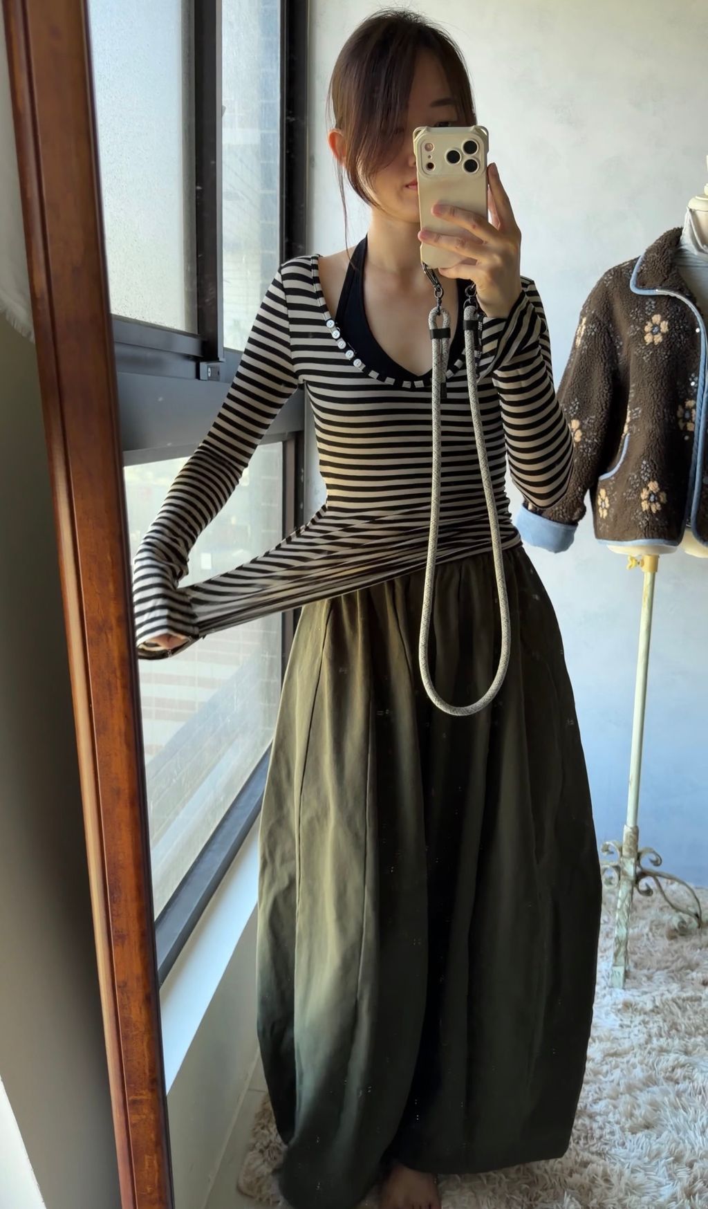 搭配的十六片拼接大寬褲是這件軍綠色: