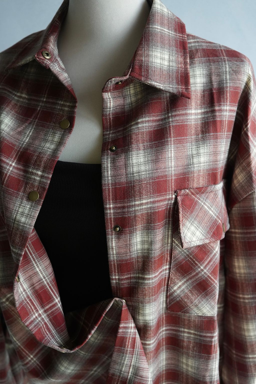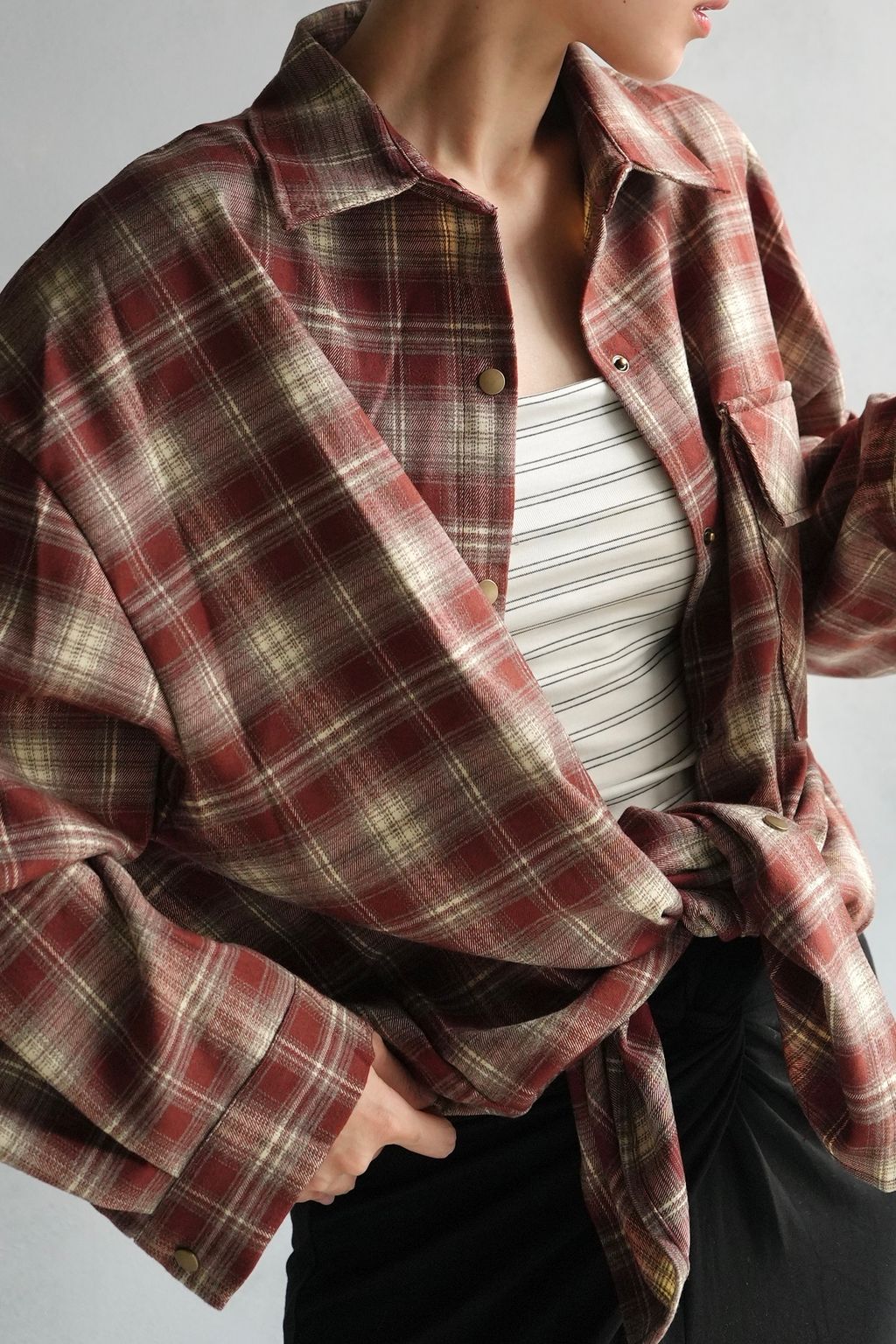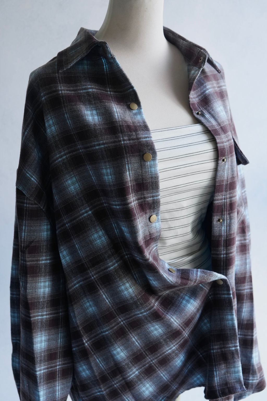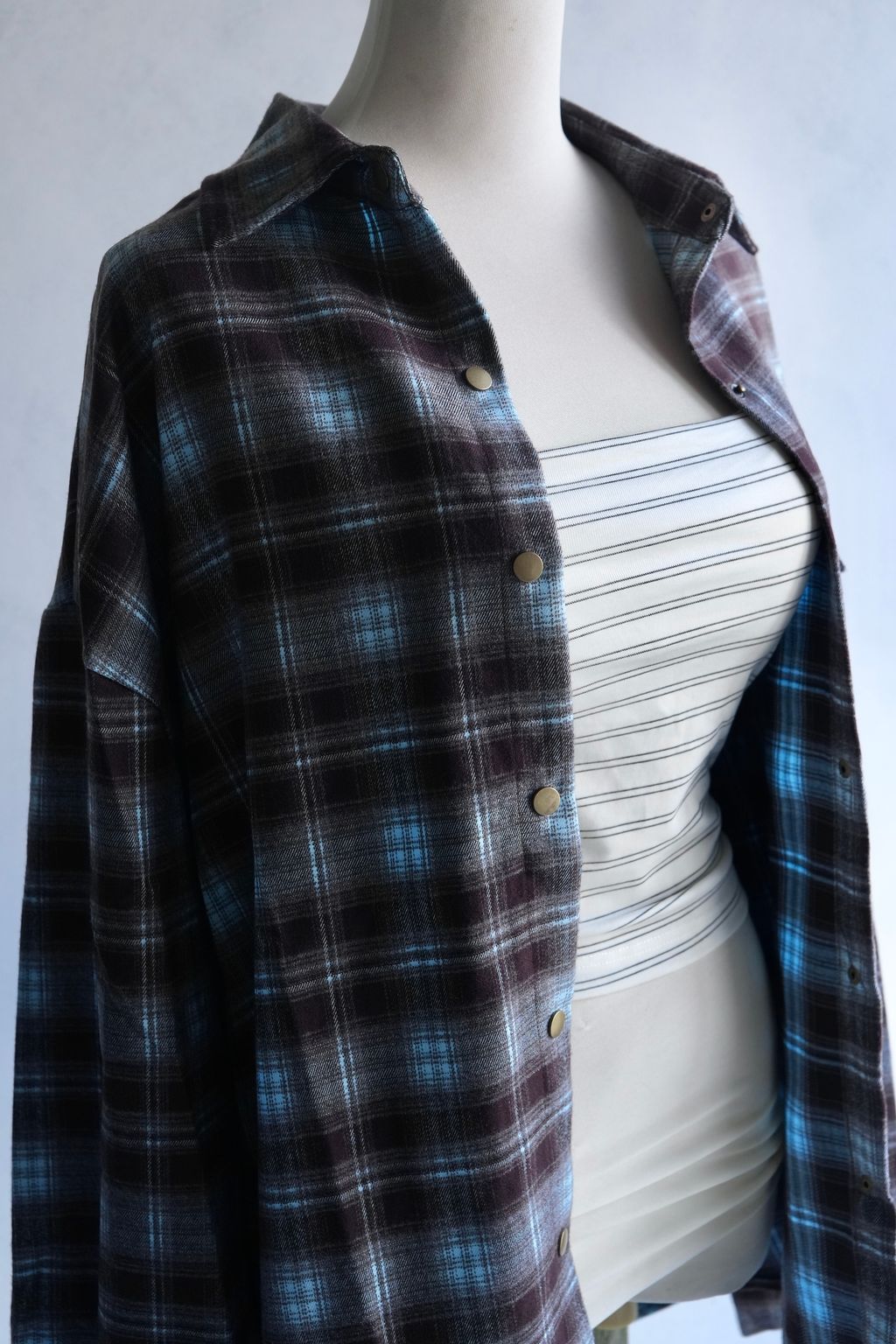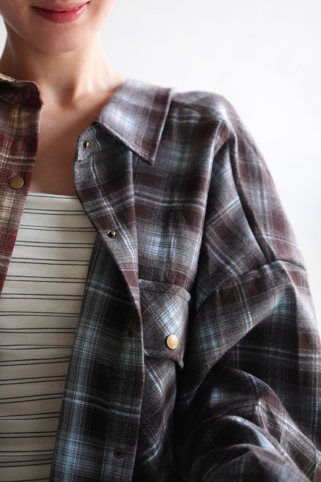 [C] 銅釦電幻迷濛撞色格紋襯衫外套|藍紅系*寬鬆版