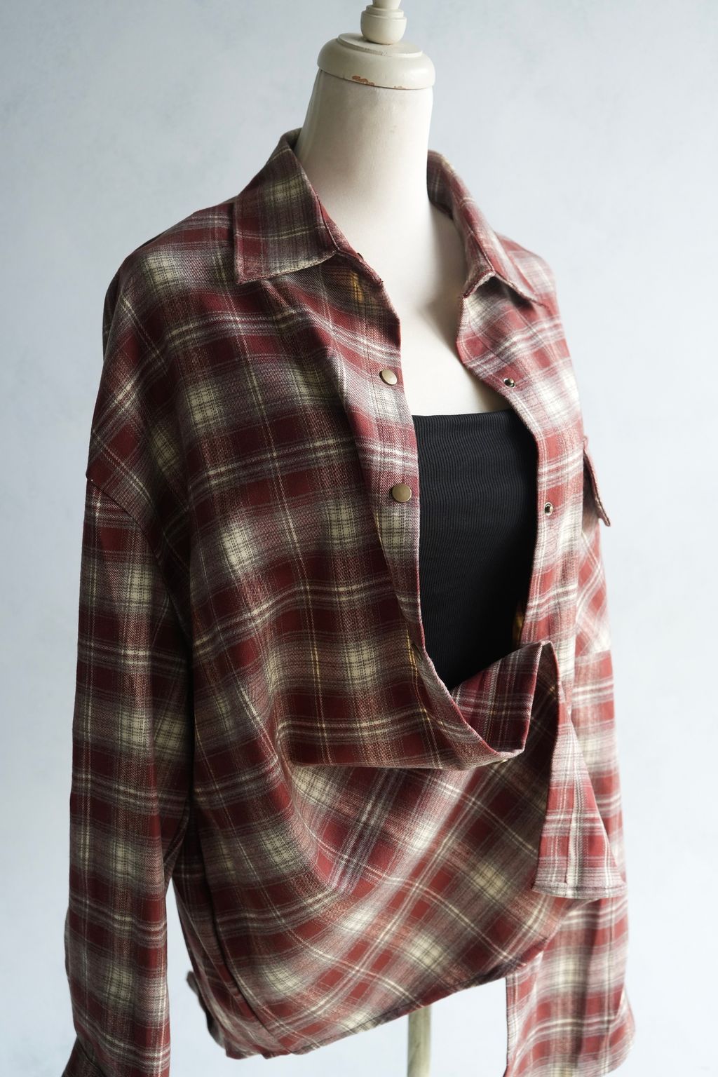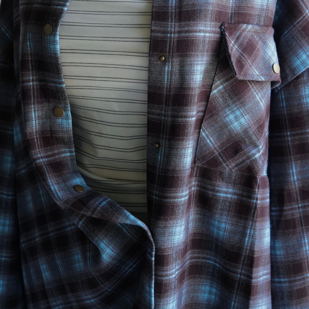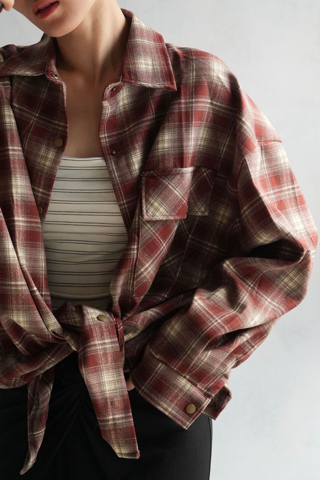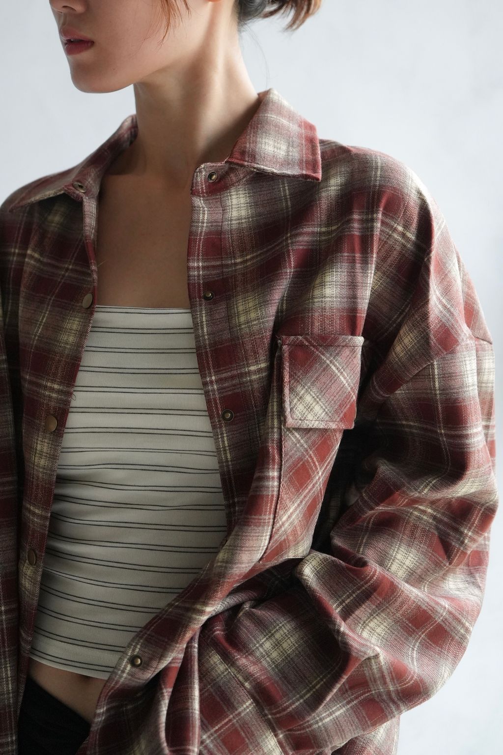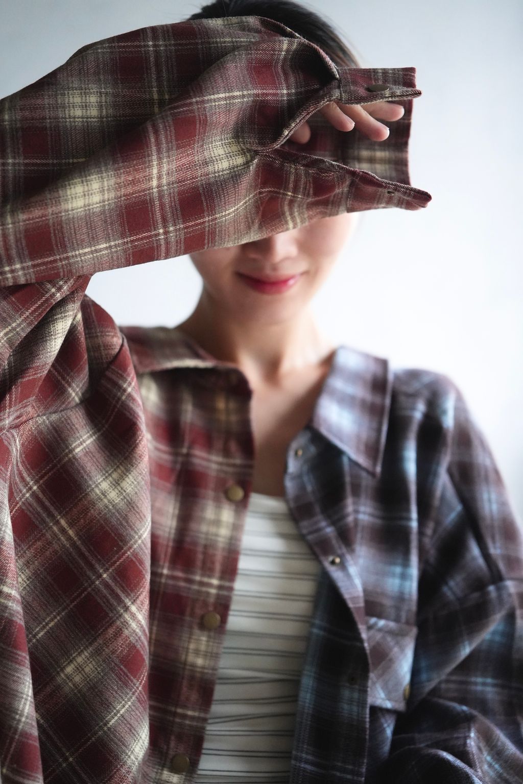 [C] 銅釦電幻迷濛撞色格紋襯衫外套|藍紅系*寬鬆版