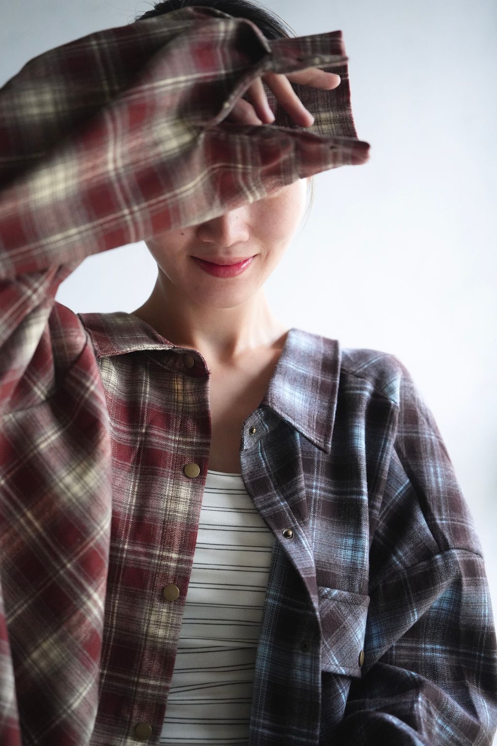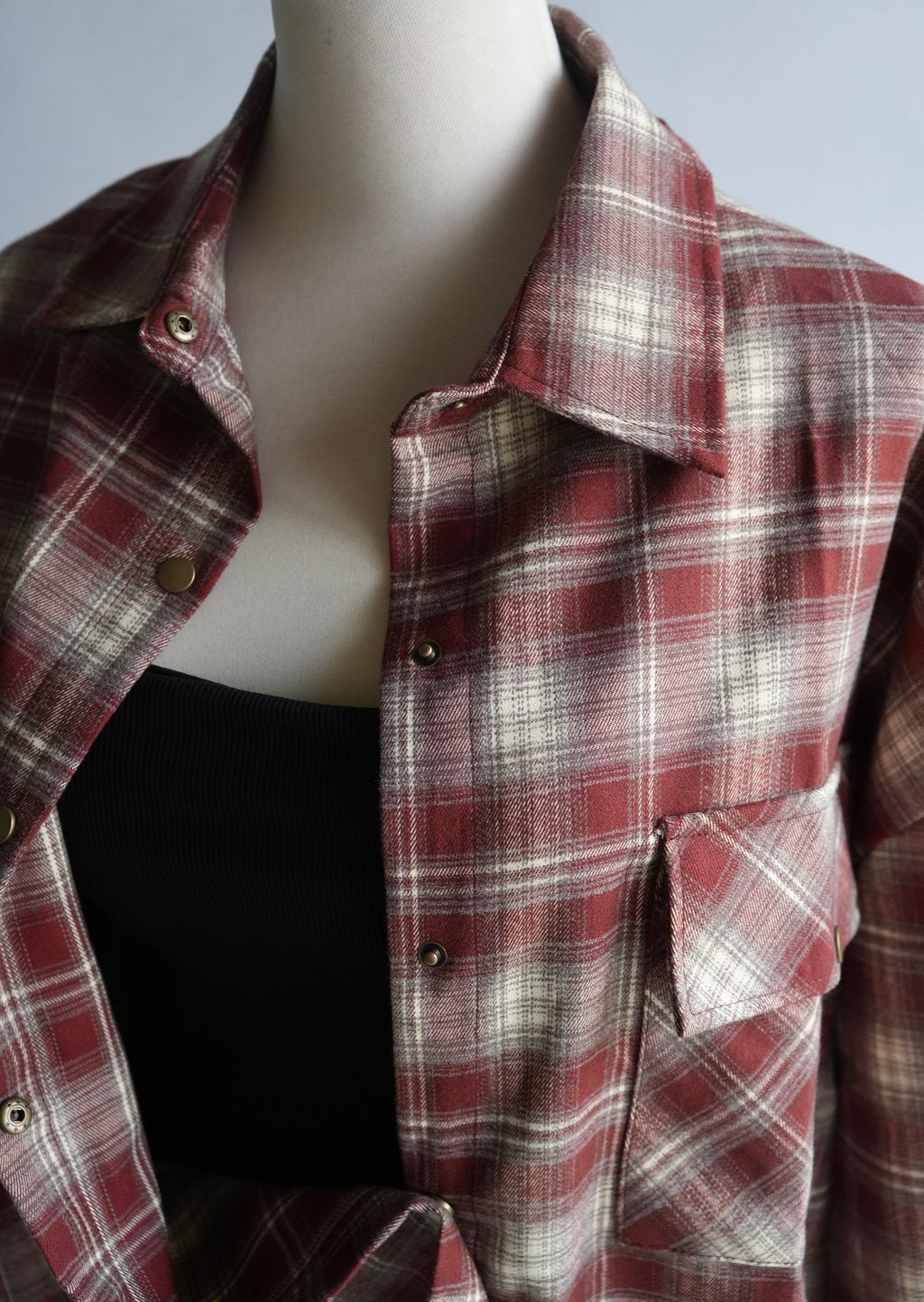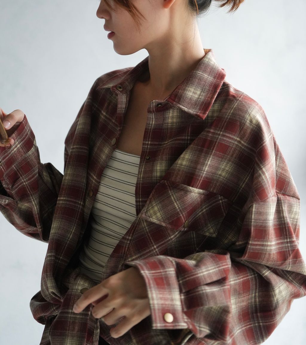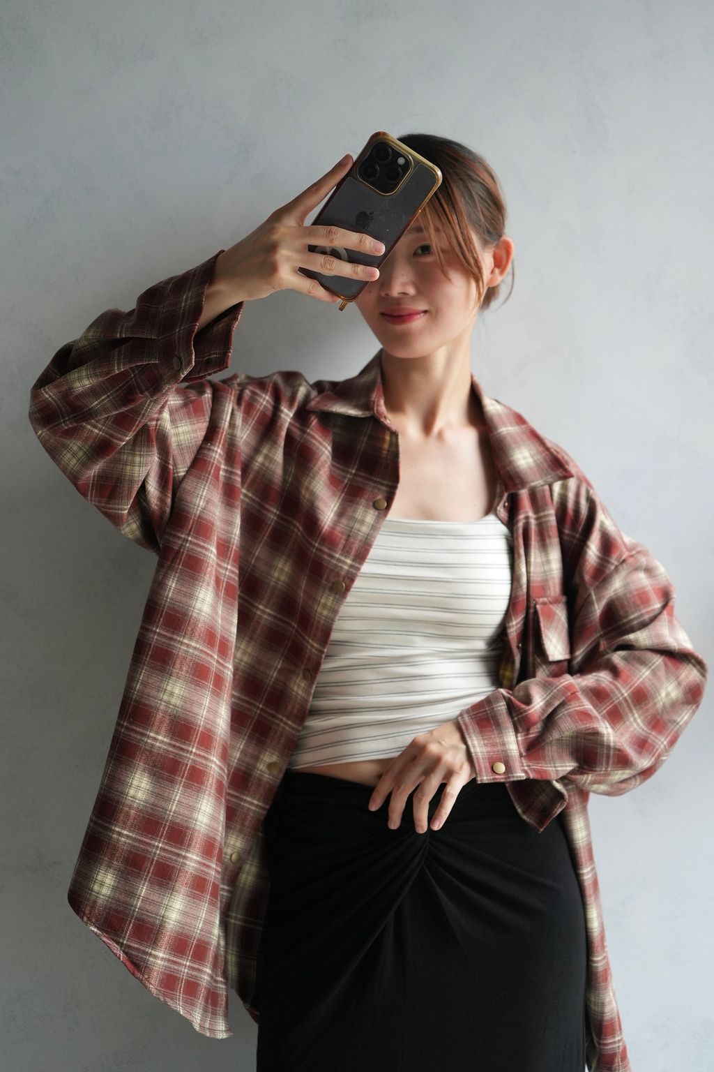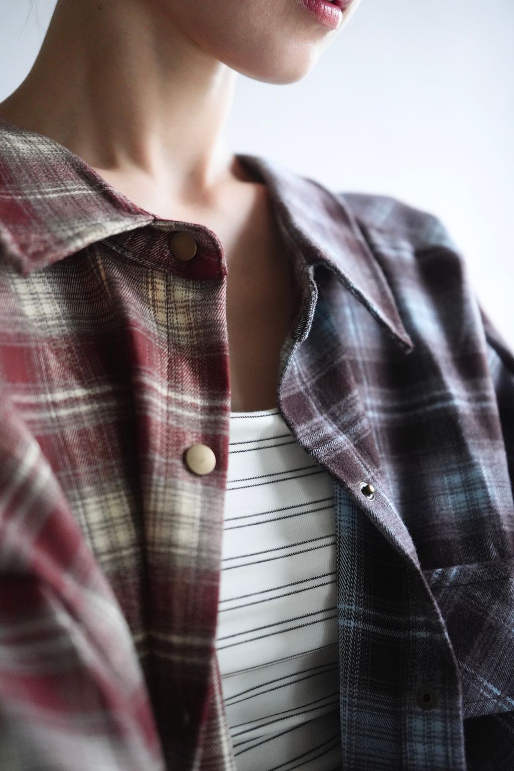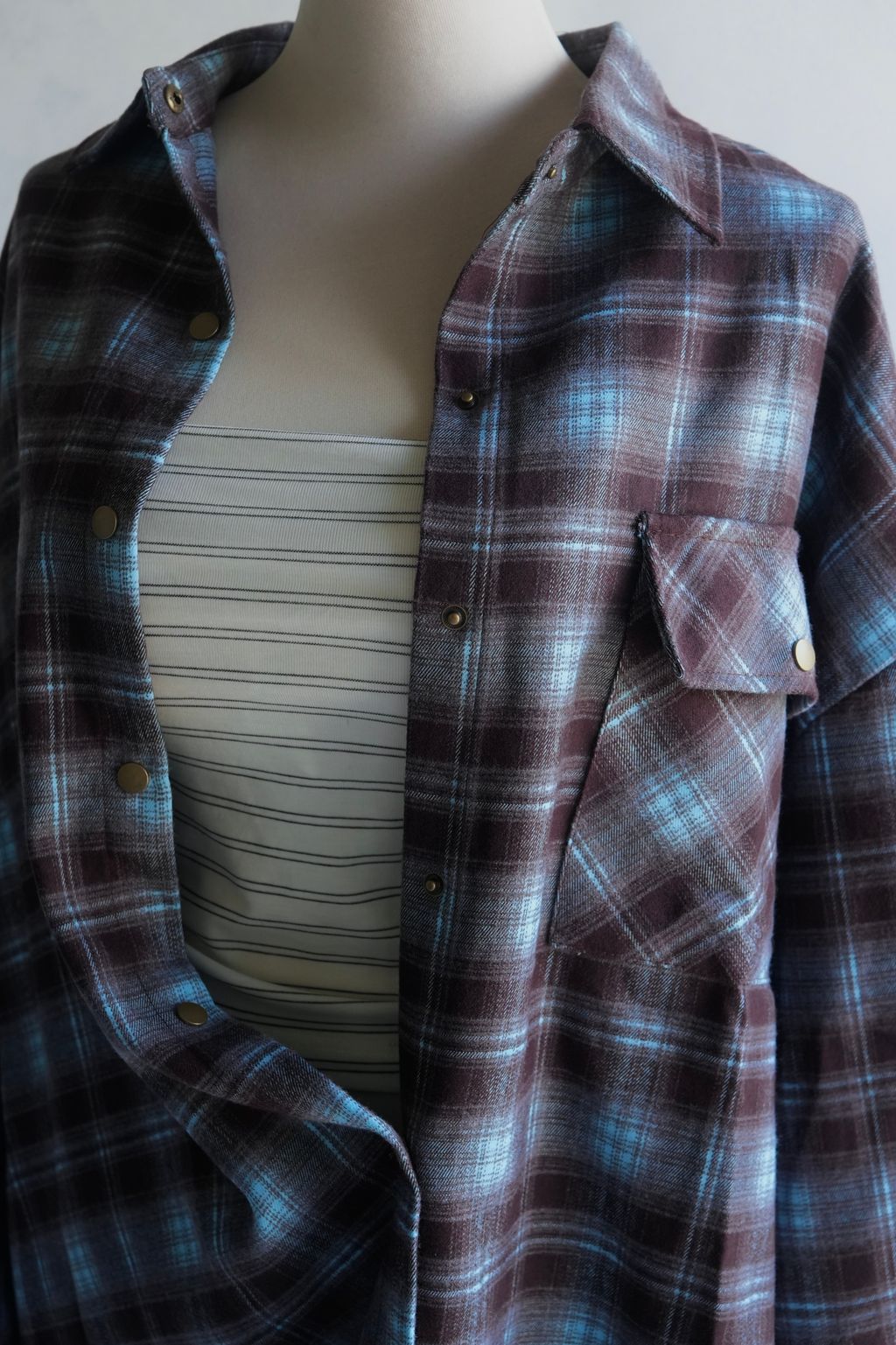 [C] 銅釦電幻迷濛撞色格紋襯衫外套|藍紅系*寬鬆版
