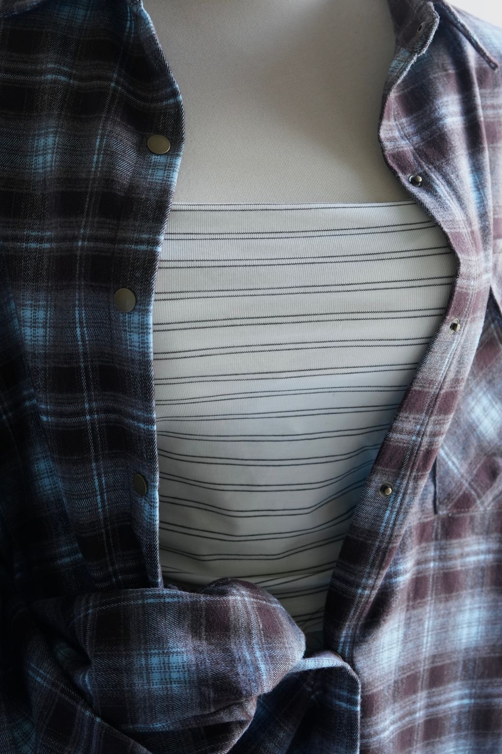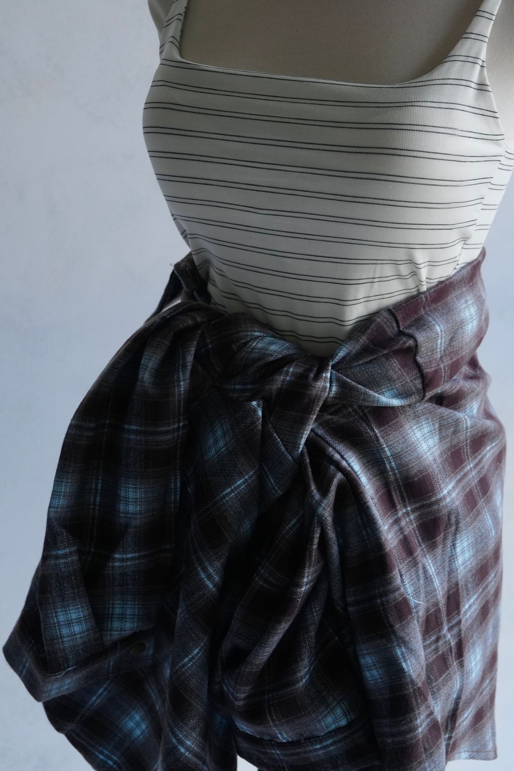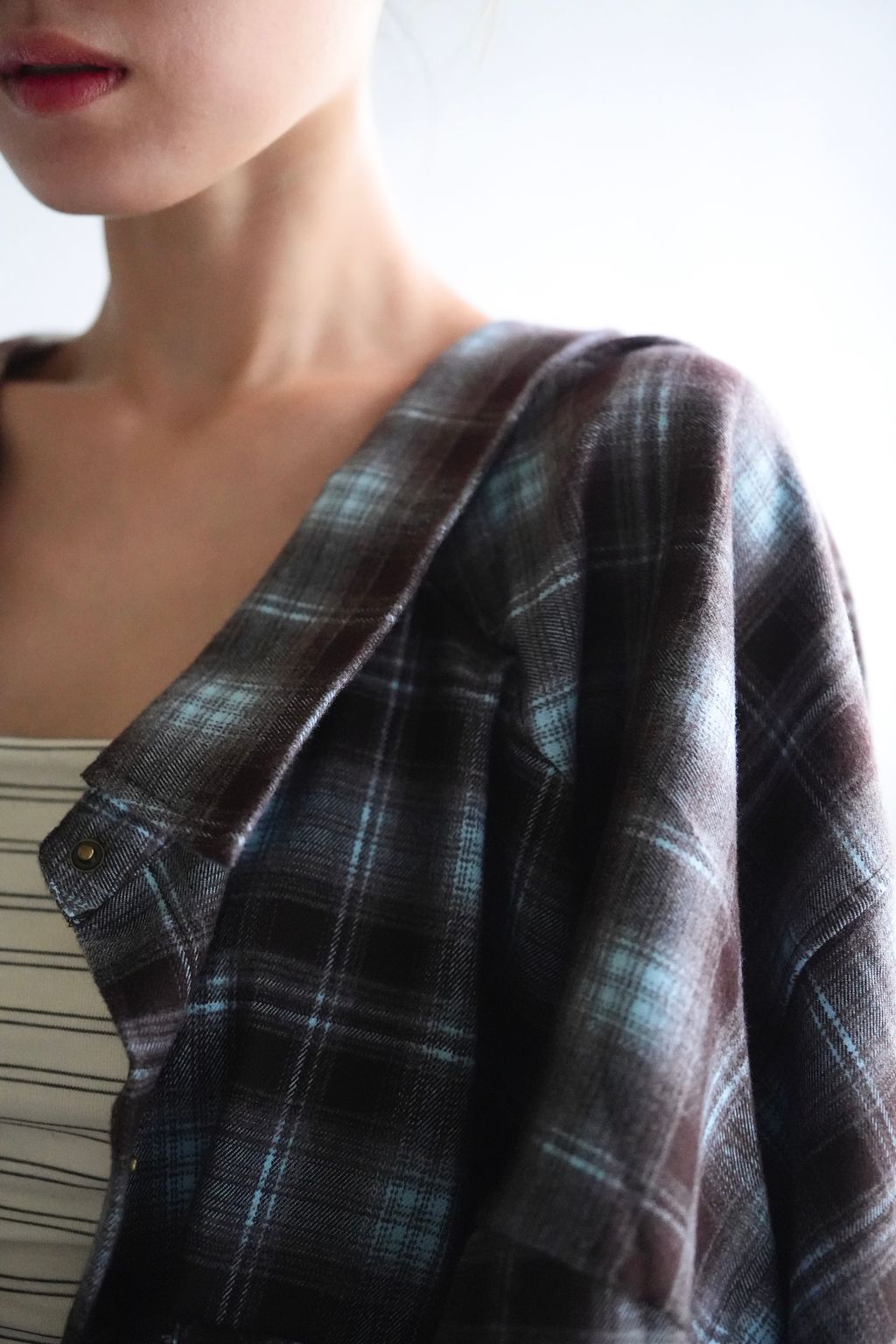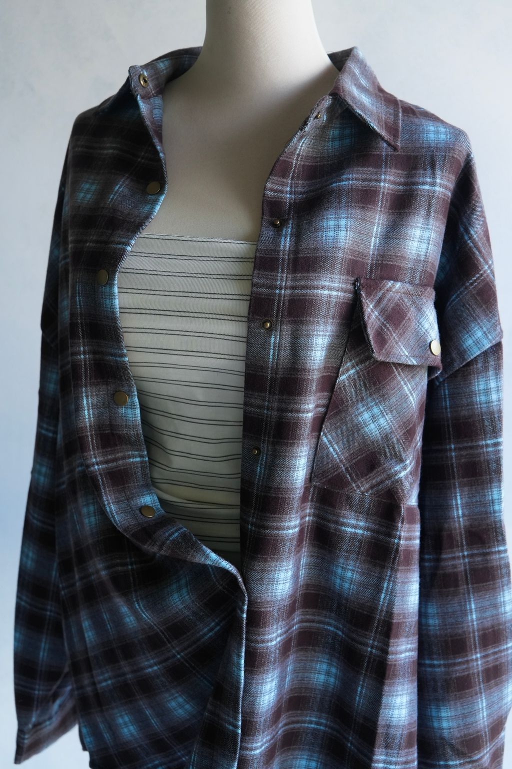 質感銅釦搭配迷濛電幻藍棕格紋撞色