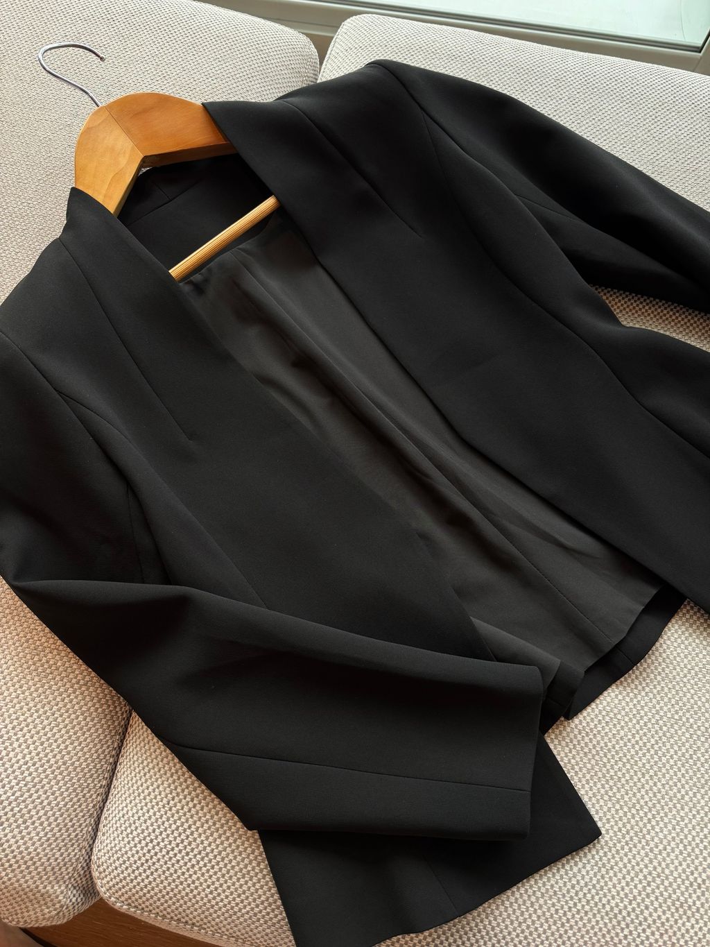 她使用的是醋酸纖維加入亞麻的高級西裝布料