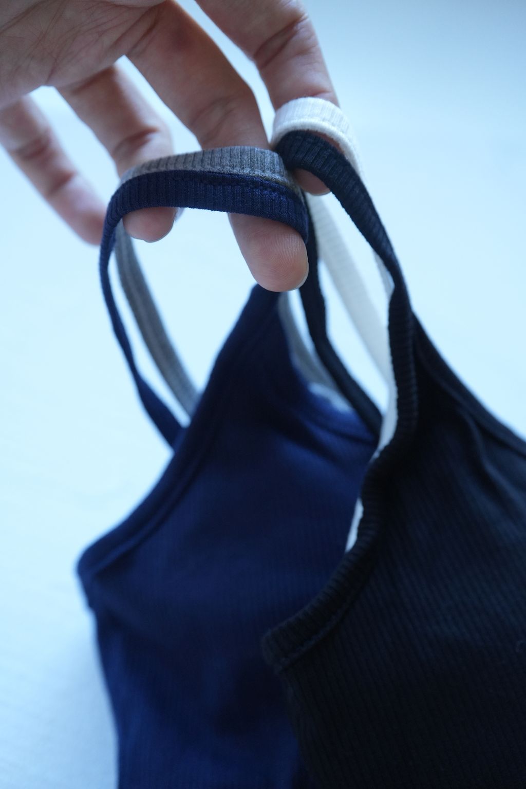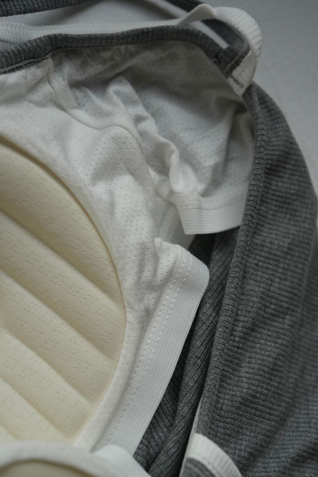 這塊布料很柔軟 螺紋彈力大且上身體感舒適不會勒 內襯材質也很用心 使用彈力透氣網布以及固定式透氣胸墊 好洗免拆卸
