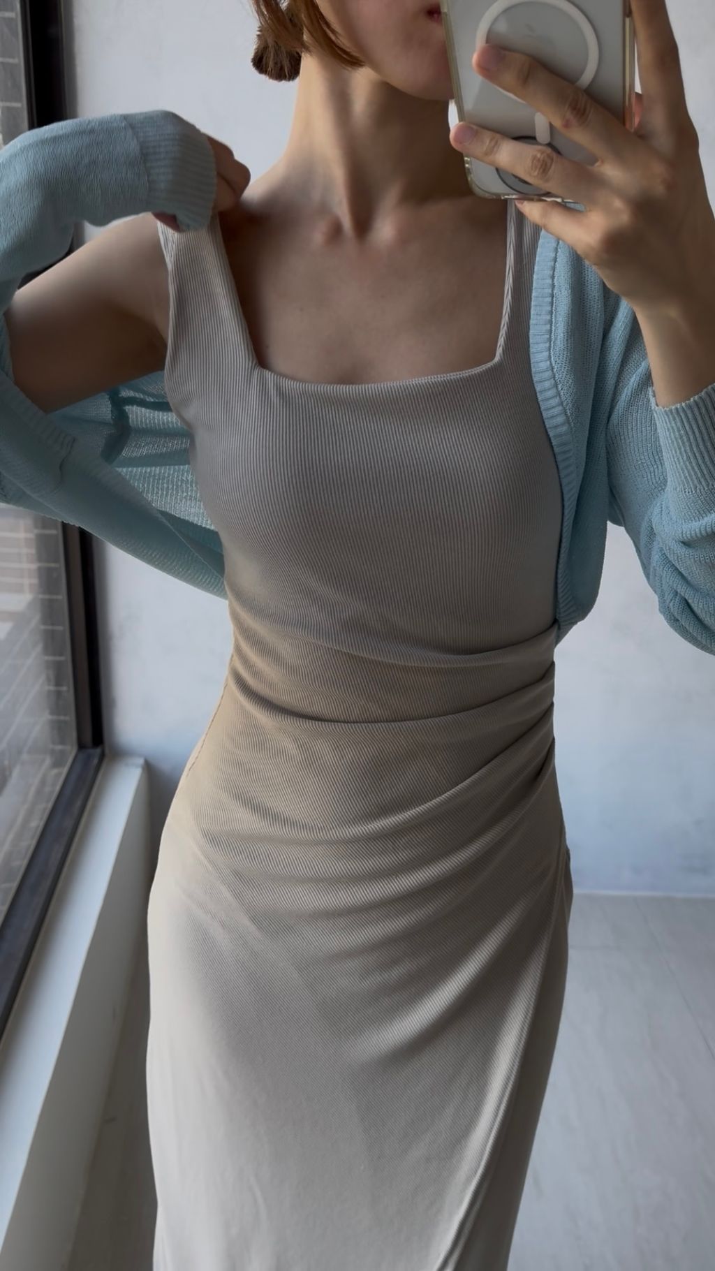 這件感人的彈力BraTop洋裝,她的腰線做得很高,幾乎從胸下就開始收,拉長下身比例,且她的皺褶可以有效製造視覺收縮感,非常有感修飾我們的小肚肚,平常這種貼身洋裝肚子幾乎是不忍直視的...IG我有錄一組驚悚對照影片🫣